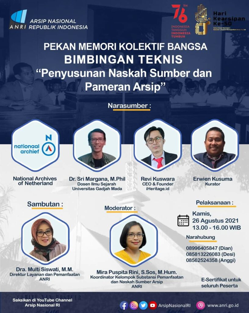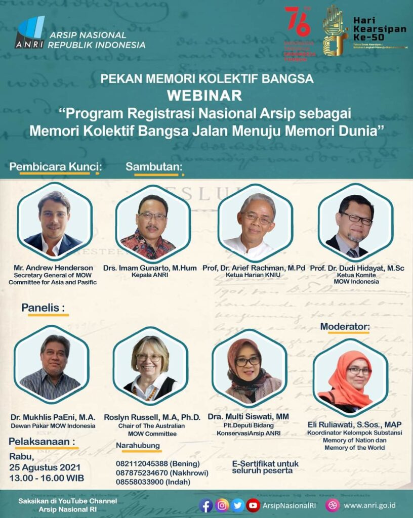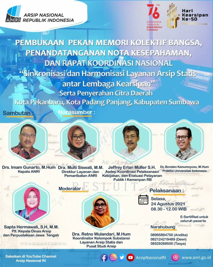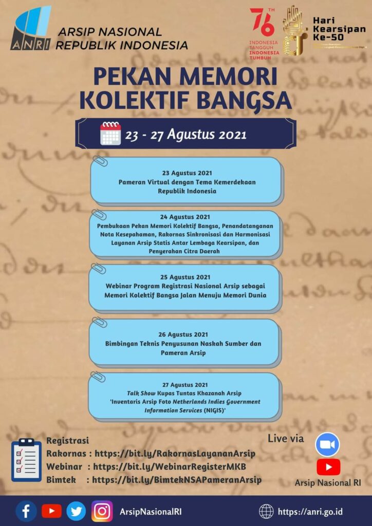 Dalam rangka memperingati Hari Kemerdekaan ke-76 Republik Indonesia, @arsipnasionalri akan menyelenggarakan serangkaian kegiatan bertajuk Pekan Memori Kolektif Bangsa mulai dari tanggal 23 s.d. 27 Agustus 2021.